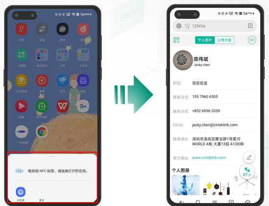 除此以外,越来越多的NFC应用被不断发掘出来,例如NFC名片。手机触碰NFC名片可以保存对方号码,了解对方个人信息比如姓名、职位、电话、邮箱、微信二维码等,也可以了解对方的公司简介、地址、视频、图片、网站等,非常方便快捷。