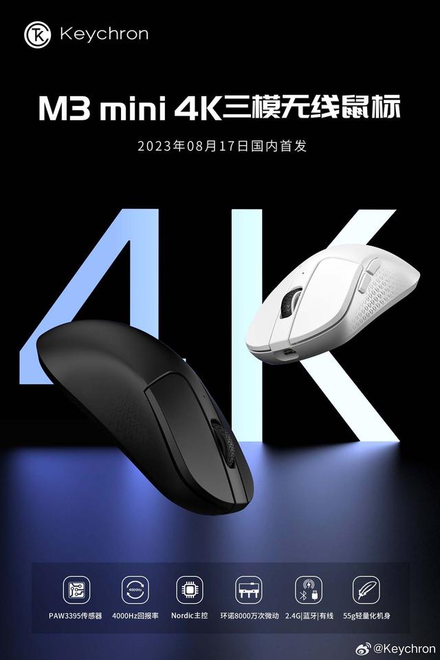 8 月 17 日消息,Keychron今日发布新款 M3 mini 4K 鼠标,今晚 8 点开售,首发 369 元。