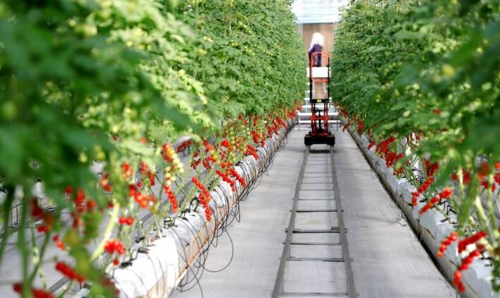 近日,在寿光市丹河设施蔬菜标准化生产示范园的智能玻璃温室内,工作人员在仔细检查番茄的生长情况。在这里,正压环控系统、水肥智能供给系统、可视化智慧管控云服务系统一应俱全,处处充满了农业“黑科技”。